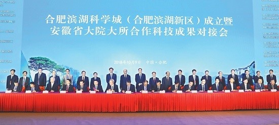 10月9日上午,合肥滨湖科学城(合肥滨湖新区)成立暨安徽省大院大所合作科技成果对接会在合肥隆重举行。省委书记李锦斌宣布开幕。省委副书记、省长李国英讲话。省委常委、合肥市委书记宋国权,中国科学院副院长相里斌,中国工程院副院长何华武,中国电科集团总经理吴曼青,清华大学副校长尤政致辞。省委常委、常务副省长邓向阳主持仪式。省领导陶明伦、孙云飞、沈强、李平,中国科大校长包信和,国家发改委、科技部、工业和信息化部有关负责同志,一批大院大所负责同志出席仪式。