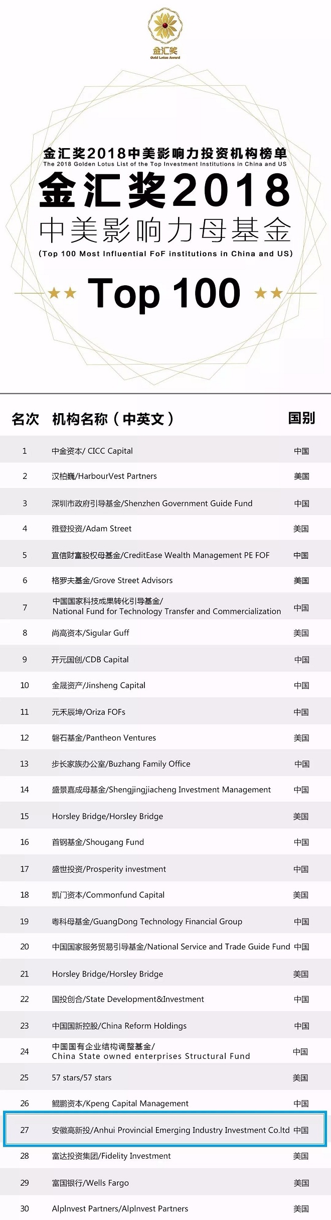 “金汇奖”是由多家权威机构打造的专注于母基金行业的专业奖项,于2016年设立并发布中国股权私募排行榜。本次发布的“金汇奖2018中美投资机构影响力榜单”分为“中美股权母基金影响力TOP100”与“中美股权基金影响力TOP100”,由中美两国共一百家行业领先的母基金进行评分与评选。